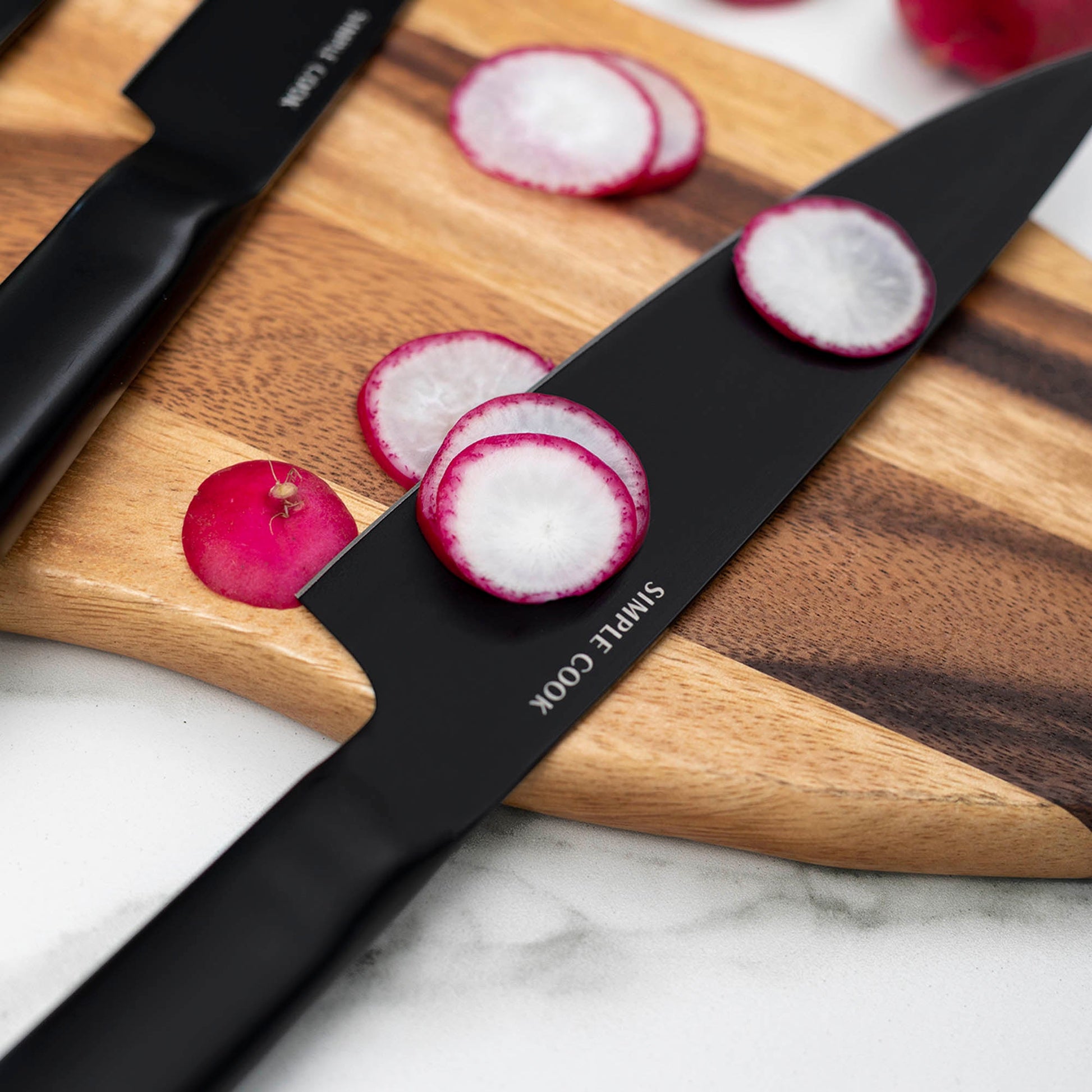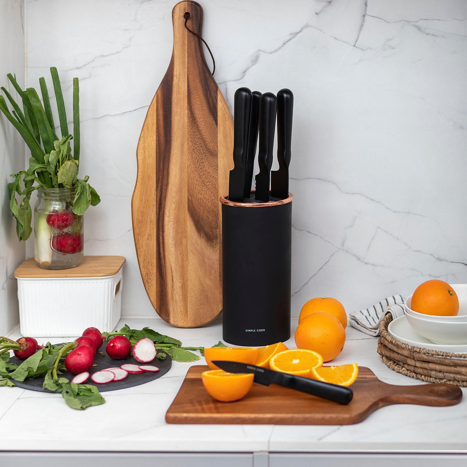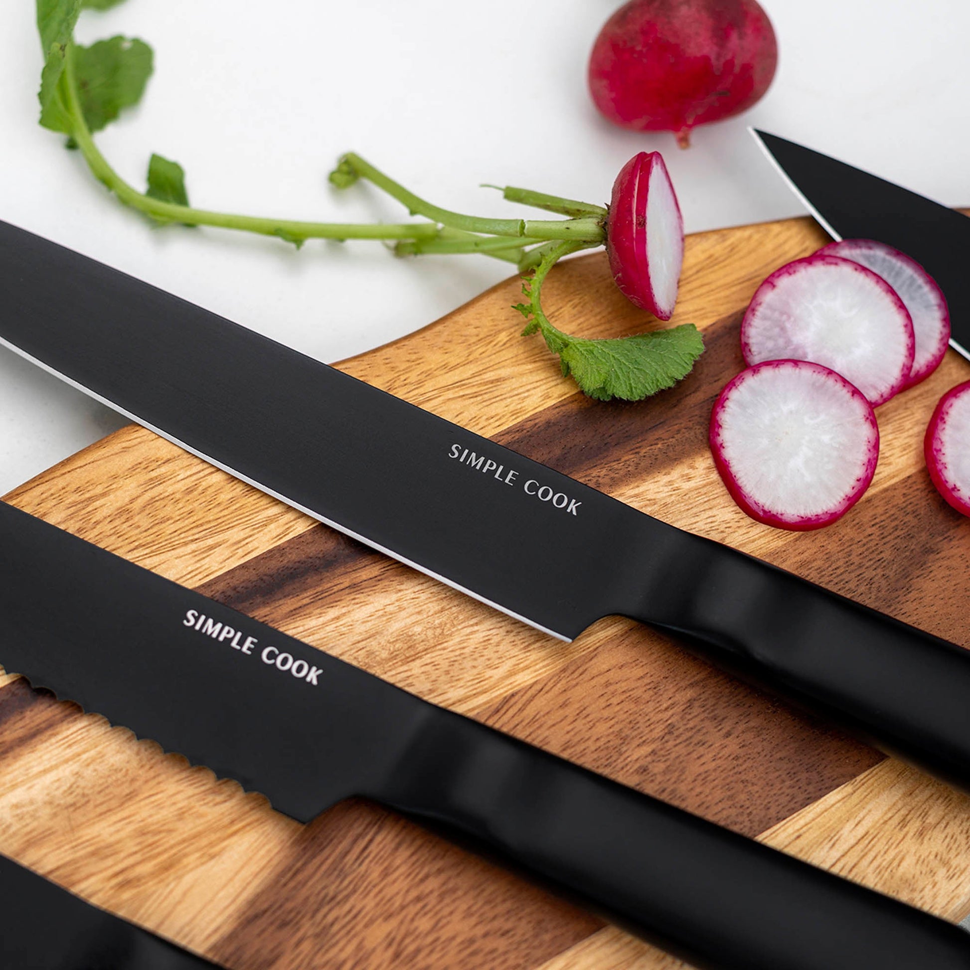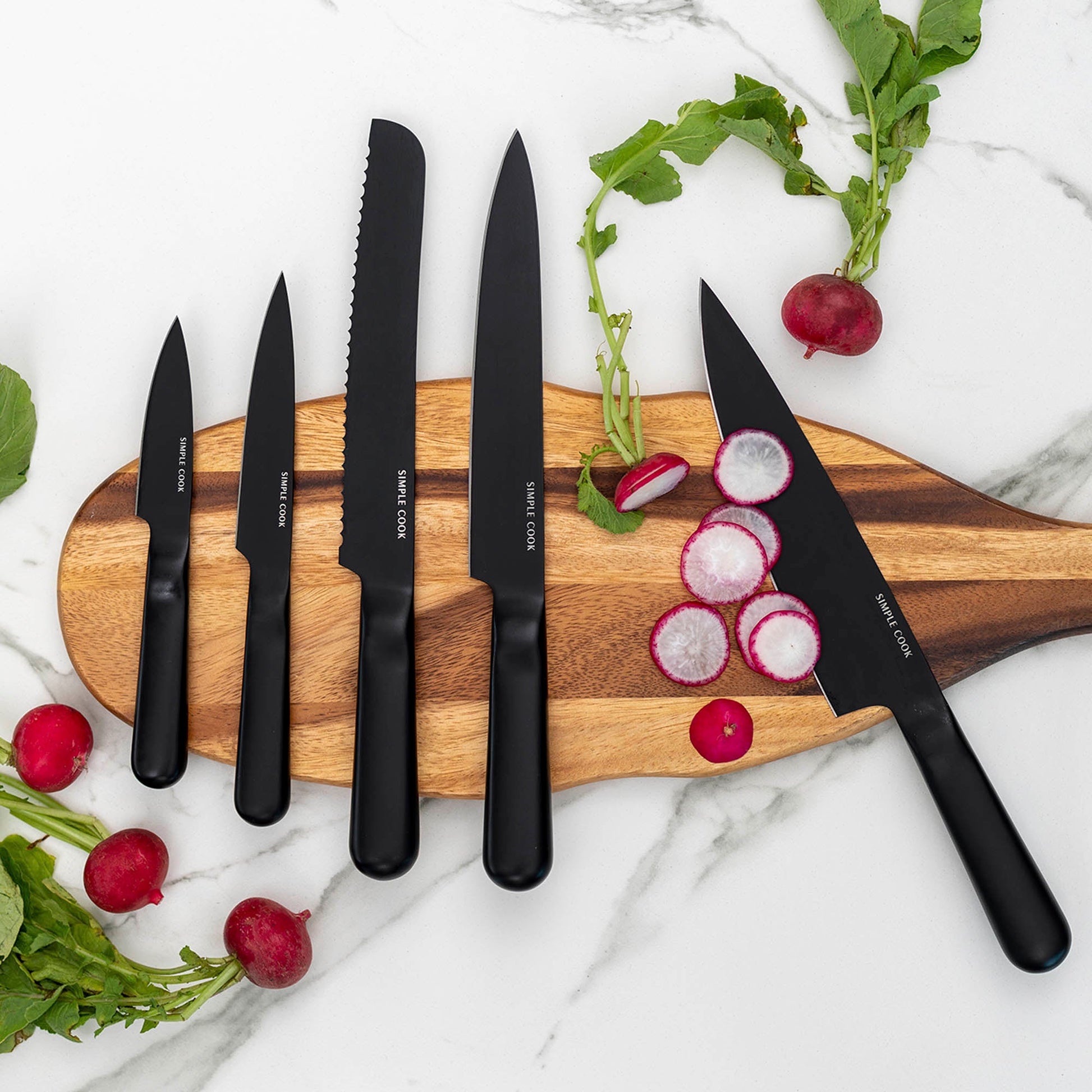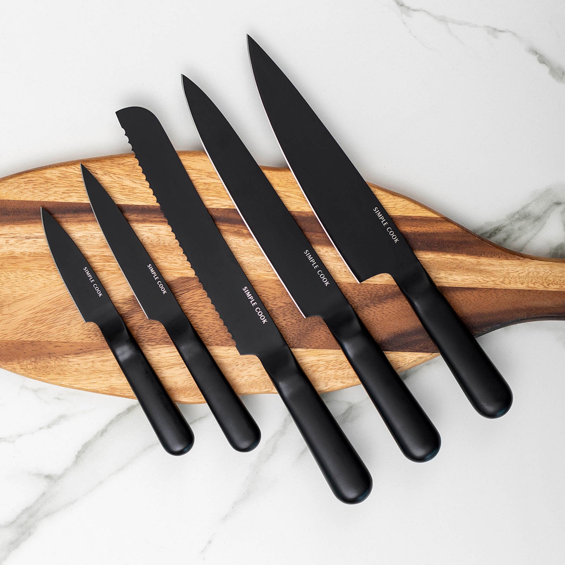 El set incluye: Cuchillo Chef de 8", Cuchillo de Pan de 8", Cuchillo Fileteador de 8", Cuchillo Multiusos de 5" y Cuchillo Pelador de 3,5". Perfecto para cortar, rebanar y pelar con precisión. ¡Renueva tu cocina con este indispensable que combina calidad y diseño único!